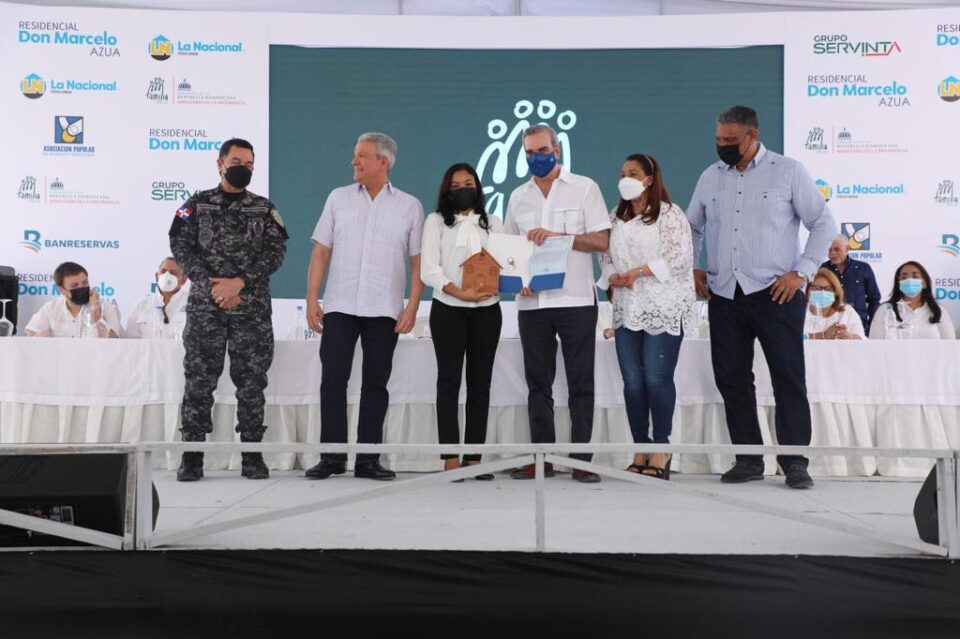 AZUA.-El presidente Luis Abinader y el ministro de la Presidencia, Lisandro Macarrulla, entregaron este sábado 80 apartamentos a igual número de beneficiarios, lo que impactará positivamente y elevará la calidad de vida a alrededor de 400 personas, con lo que se completa la segunda entrega de soluciones habitaciones del Plan Nacional de Viviendas Familia Feliz.