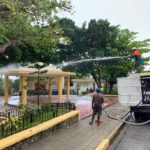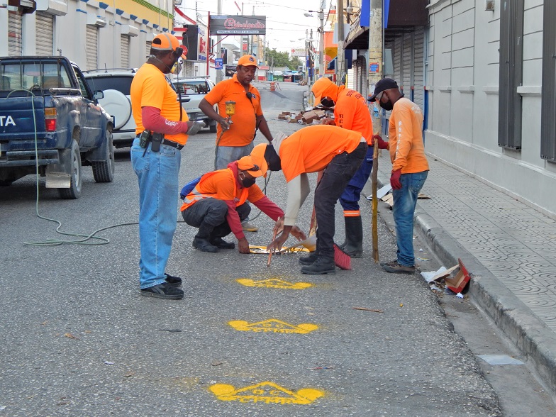 BARAHONA.- A fin de que las personas mantengan el distanciamiento social para prevenir la propagación del COVID-19, miembros de la Defensa Civil de esta ciudad, pintaron espacios de dos metros en la calle Padri Billini, frente a la sucursal del banco Popular.