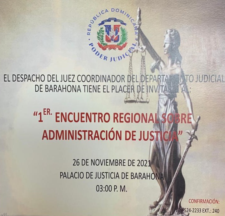 BARAHONA.- El despacho del juez coordinador del Departamento Judicial de Barahona invita al “Primer Encuentro Regional Sobre Administración de Justicia” en el Palacio de Justicia de esta ciudad.