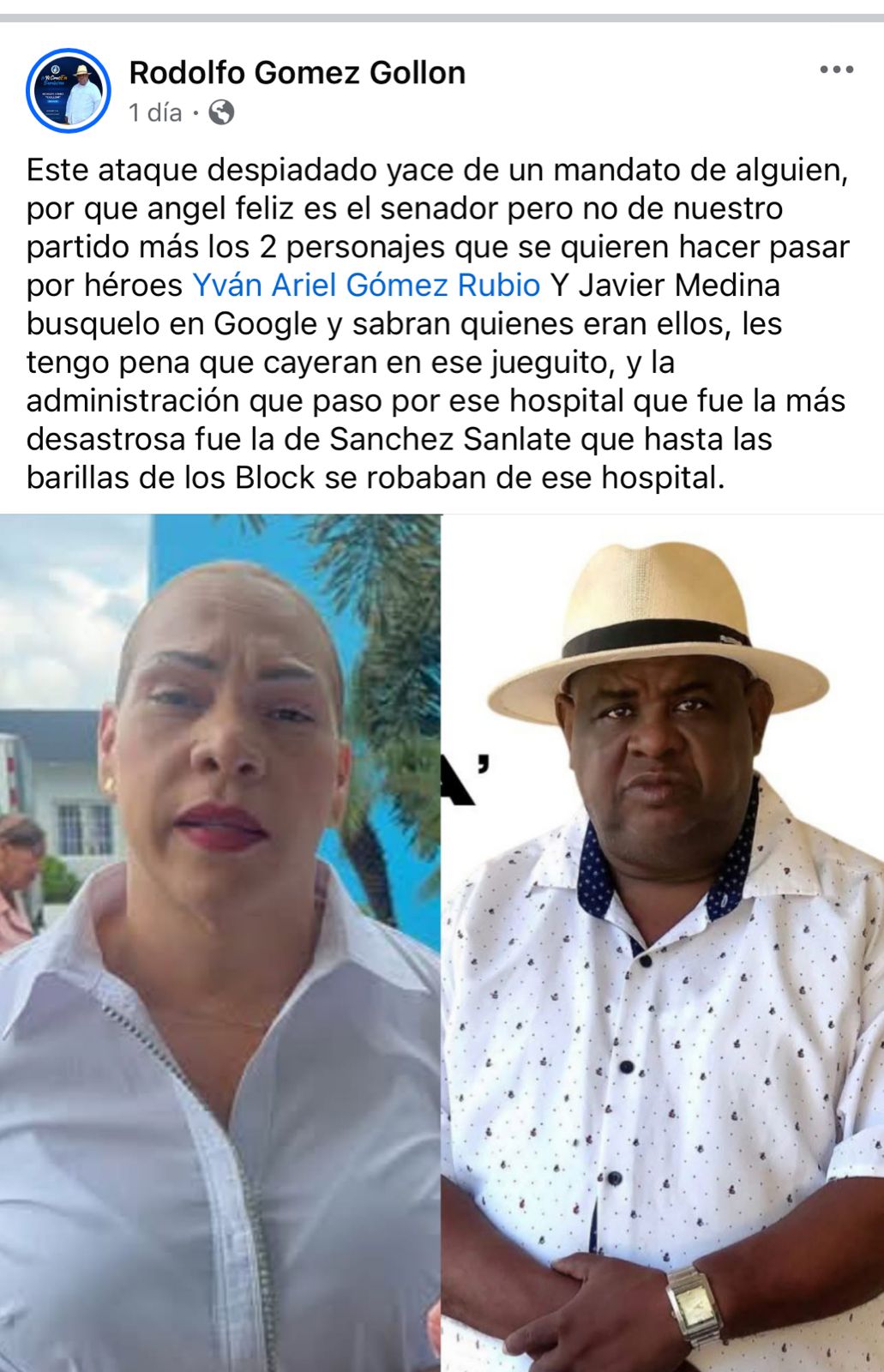 “Este ataque despiadado yace de un mandato de alguien, por que angel feliz es el senador pero no de nuestro partido más los 2 personajes que se quieren hacer pasar por héroes Yván Ariel Gómez Rubio Y Javier Medina busquelo en Google y sabran quienes eran ellos, les tengo pena que cayeran en ese jueguito, y la administración que paso por ese hospital que fue la más desastrosa fue la de Sanchez Sanlate que hasta las barillas de los Block se robaban de ese hospital”.