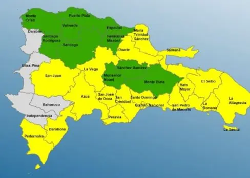 En su informe más reciente, el COE indica que están en alerta amarilla las provincias: Hato Mayor, San Pedro de Macorís, La Romana, La Altagracia, Samaná, Barahona, Azua, San Juan, Peravia, El Seibo, La Vega, María Trinidad Sánchez, Duarte, San Cristóbal, Distrito Nacional, Santo Domingo, San José de Ocoa y Pedernales.