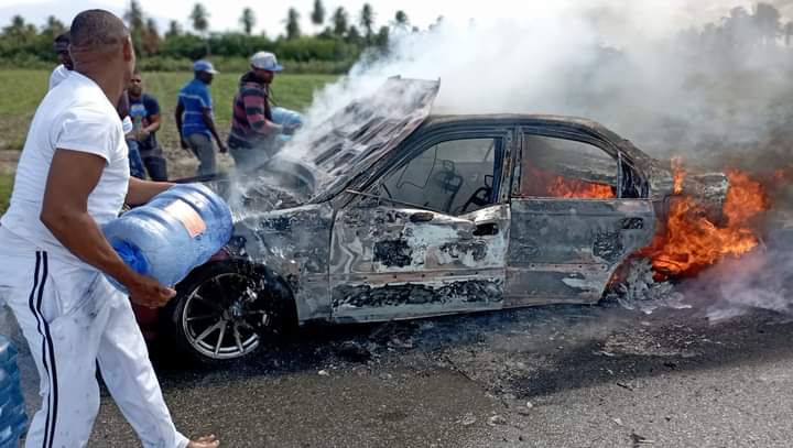 El hecho ocurrió a las 3:10 minutos de ésta tarde miércoles santo, cuando el caballero retornaba del Distrito Municipal de Santa Bárbara Batey #6 de llevar a su madre, en la marcha sintió el fuego que inició en el baúl.