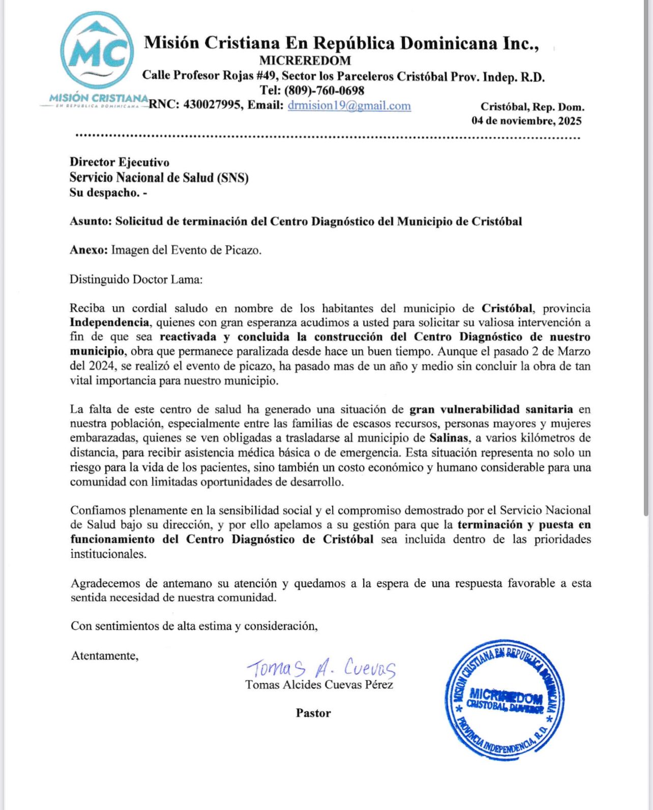 “Reciba un cordial saludo en nombre de los habitantes del municipio de Cristóbal, provincia Independencia, quienes con gran esperanza acudimos a usted para solicitar su valiosa intervención a fin de que sea reactivada y concluida la construcción del Centro Diagnóstico de nuestro municipio, obra que permanece paralizada desde hace un buen tiempo. Aunque el pasado 2 de marzo del 2024, se realizó el evento de picazo, ha pasado más de un año y medio sin concluir la obra de tan vital imponencia para nuestro municipio”, sostuvo, Cuevas.