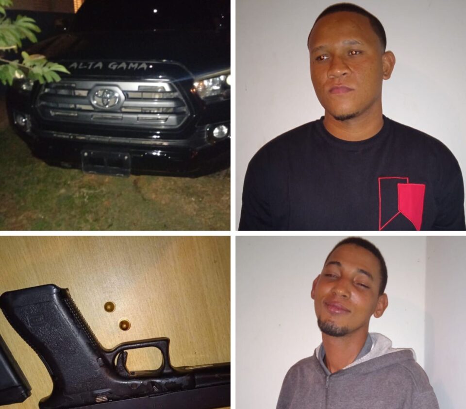 OVIEDO, Pedernales.- Dos sujetos abordo de una yipeta fueron apresados la madrugada del domingo por agentes de la Policía en un operativo en Tres Charcos, a los que ocuparon una pistola Glock sin documentos.
