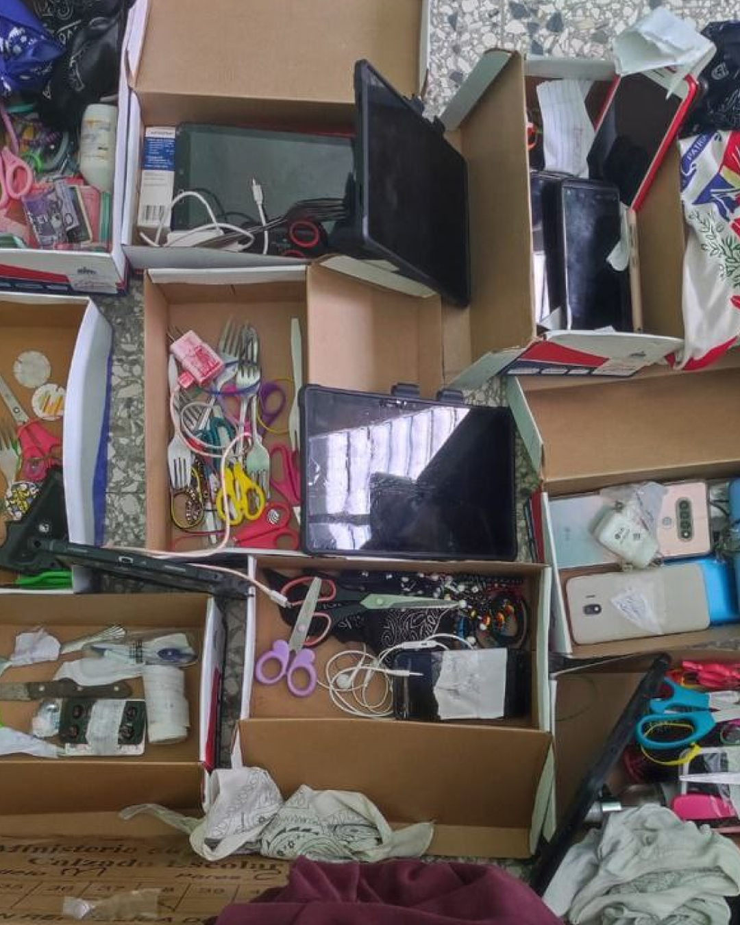 Miembros de la Policía Escolar acompañados por el personal del Centro Educativo Mauricio Báez del municipio Palenque, San Cristóbal, autorizados por la titular de la Fiscalía de Niñas, Niños y Adolescentes, en aras de mantener la seguridad en las escuelas, ocuparon 13 tenedores de metal, 23 tijeras con puntas, 1 cuchillo, frascos con medicamentos sin ninguna prescripción y más de 10 mil pesos en dinero falso.